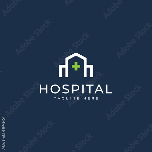 Hospital Logo. House with Cross Plus Sign Combination isolated on white Background.