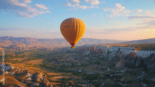 Hot air balloon over Cappadocia landscape at sunrise (1)