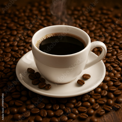 Hot Black Coffee in White Cup with Roasted Beans – Aromatic Morning Scene- Generated AI