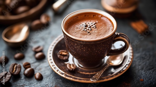 Hot dark chocolate or espresso coffee in brown ceramic cup with saucer surrounded by coffee beans on rustic wooden surface