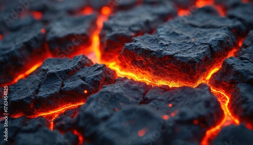 Hot volcanic rock with lava cracks. Dark stones with fiery orange molten glowing between. Abstract geology background texture. Magma creates heat. Danger concept for desktop wallpaper. Volcano