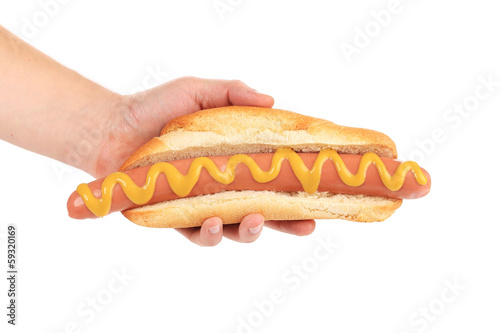 Hotdog with mustard in hand.