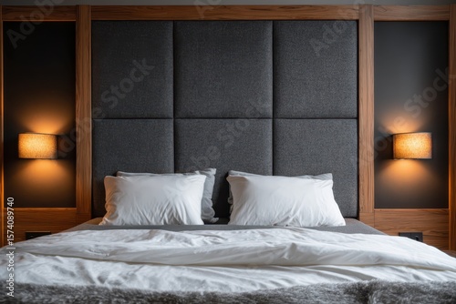 Hotel room bed, lamps illuminate wall; for lodging promotions or interior design