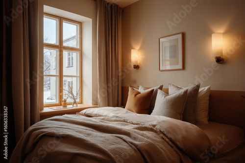 Hotel room showing neatly made bed with multiple pillows arranged against headboard, sunlight streaming through window, wall lamps illuminating space, framed artwork hanging above bed