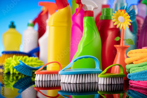 House cleaning for Christmas. Colorful cleaning kit on blue background.