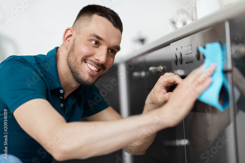 household and people concept - happy smiling man wiping table with cloth cleaning oven door at home kitchen
