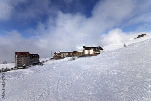 Houses and hotels on ski resort, view from ski slope