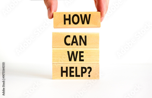 How can we help symbol. Concept words How can we help on beautiful wooden blocks. Beautiful white table white background. Businessman hand. Business and how can we help concept. Copy space.
