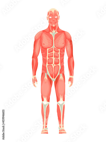 Human anatomy of male muscular system - anterior view - full body. Medical education chart for educational poster. illustration of a man figure