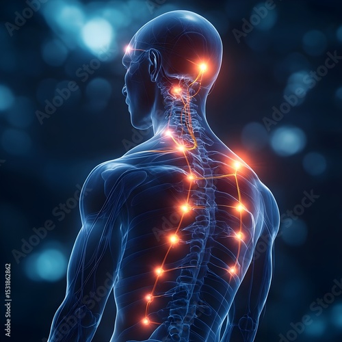 Human body with glowing red pain points on neural pathways illustrating pain or nerve stimulation, set against a dark blue background