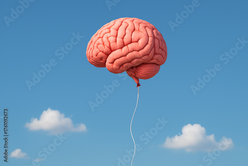 human brain flying in the sky. Brain balloon ascending in a clear sky.