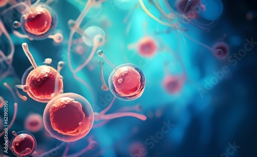 Human cell or embryonic stem cell. Cells of the body under a microscope on colorful background. Generative AI.