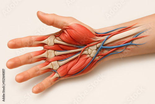 Human hand anatomy illustration showing muscles, bones, tendons, arteries, and veins in detail, used for medical education, biology study, healthcare, and anatomical reference
