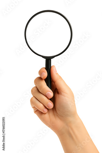 Human hand holding black magnifying glass isolated closeup investigation concept detail exploration research observation focus object tool science optical curiosity