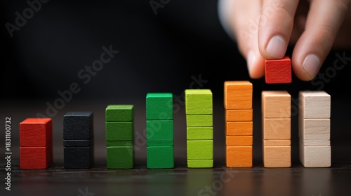 Human hand placing a red wooden block atop a colorful ascending bar graph structure