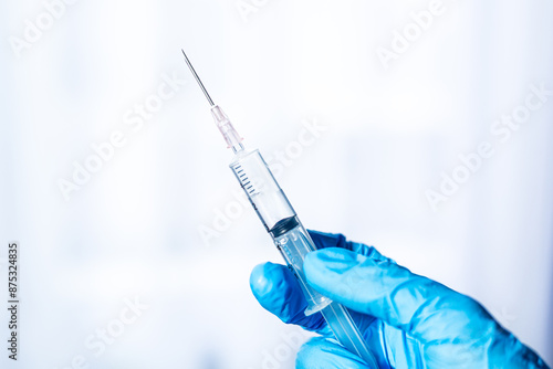 Human hand wearing medical gloves holds a syringe needle,Doctor hands with syringe on light background