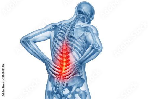 Human lower back spine pain anatomy illustration showing lumbar vertebrae inflammation skeletal system isolated on white background