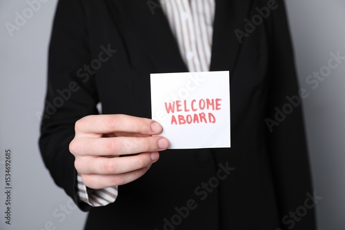 Human resources manager holding sticky note with words Welcome Aboard on grey background, closeup
