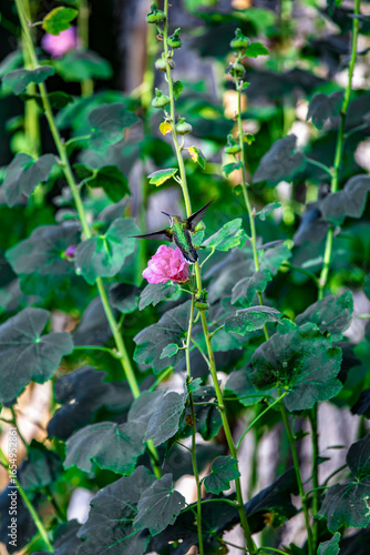 Hummingbird Flying Around Pink Flower in Green Garden