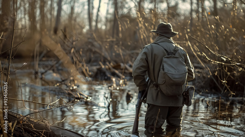 Hunter man creeping in a swamp during hunting.