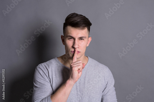 Hush sign showed by young man at gray studio background