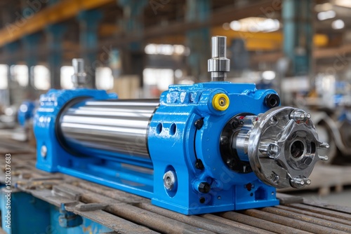 Hydraulic cylinder displayed in a manufacturing facility with machinery in the background