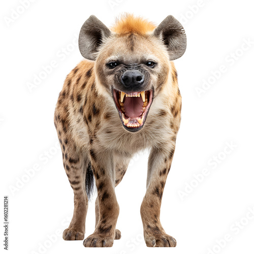 Hyena baring fangs in aggressive stance and intense close-up and snarling expression and isolated white background Batch realistic clean bright simple modern stock image isolated on plain backgrou