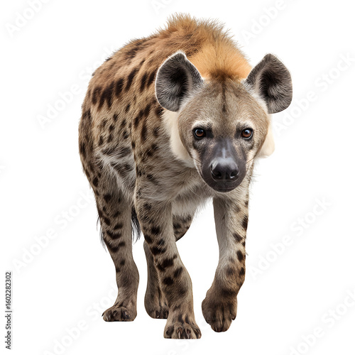Hyena walking forward with steady gaze and natural gait and high detail and isolated white background Batch realistic clean bright simple modern stock image isolated on plain background for web and
