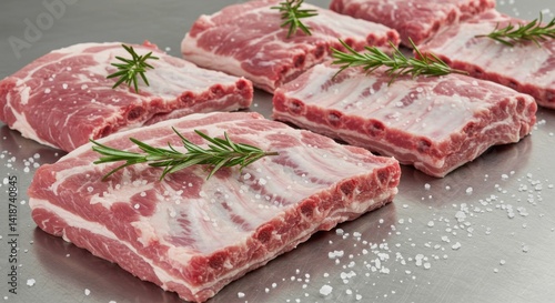 Hygienic display of raw pork ribs with fresh rosemary and coarse salt