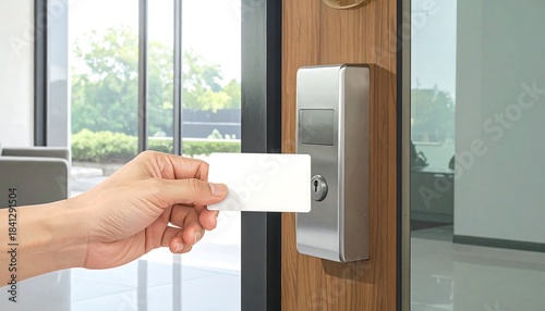 ビジネスマンがカードキーをIC認証装置にかざし電子ドアを開く様子