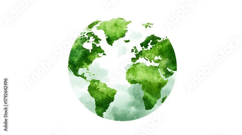ic watercolor depiction of Earth highlighting continents in vibrant green hues against a soft background symbolizing environmental consciousness nature and global ecology