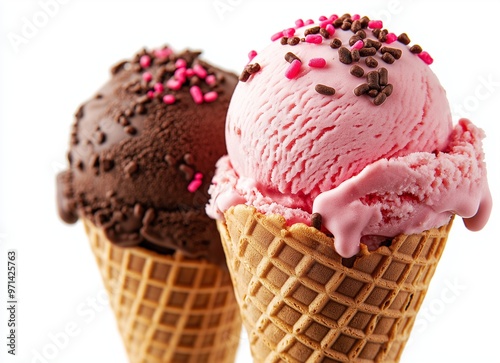 ice cream cones with different flavors on a white background
