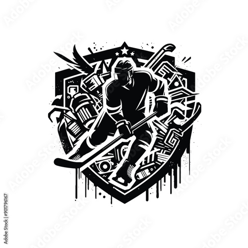 Ice Hockey sport male player with graffiti tags, street art pattern illustration, emblem shield badge