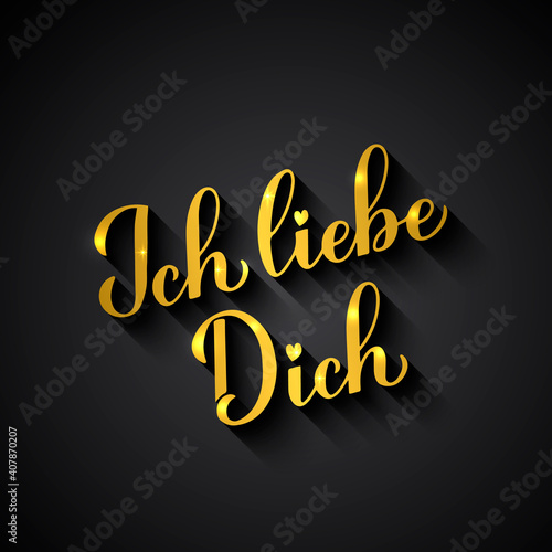 Ich liebe Dich gold calligraphy hand lettering on black background. I Love You in German. Valentines day typography poster. Vector template for banner, greeting card, label, flyer, etc