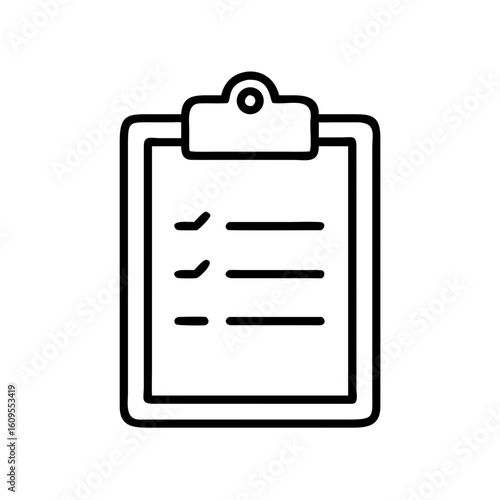 Iconic representation of a clipboard with a checklist, outlined in black on a white background plain view