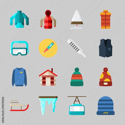 Icons about Winter with house, snow, parka, sweater, vest and goggles