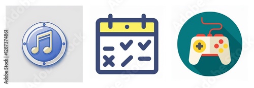 Icons of a music note in a circle, a calendar with math symbols, and a game controller in a circle, representing media, planning and entertainment.