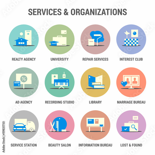 Icons set of services and organizations. Flat. Colorized.