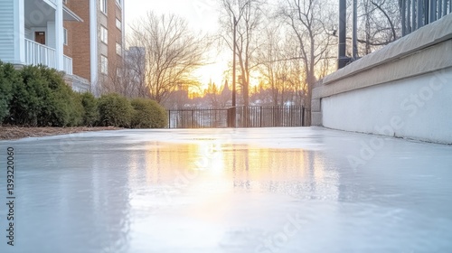 Icy Surface Apartment Building Winter Sunset Smooth Reflective Wide Shot Building Exterior Golden Hour Chill Winter Scene Real Estate Marketing