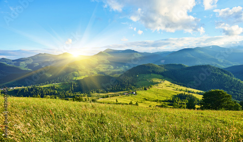 Idyllic landscape in the Alps with fresh green meadows and blooming flowers