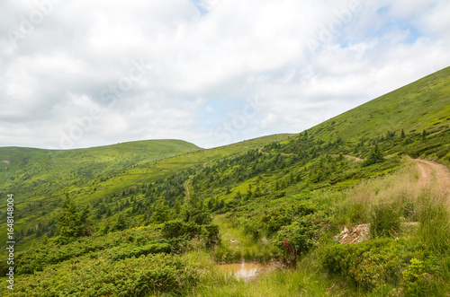 Idyllic view of vibrant green hills lush grass and distant mountains under calm blue sky. Perfect for nature travel and outdoor concepts emphasizing tranquility and scenic beauty. Carpathian Mountains