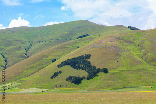 Il bosco a forma di penisola italiana (Bosco Italia) sui monti che circondano l'altipiano di Castelluccio di Norcia, Umbria, Italia
