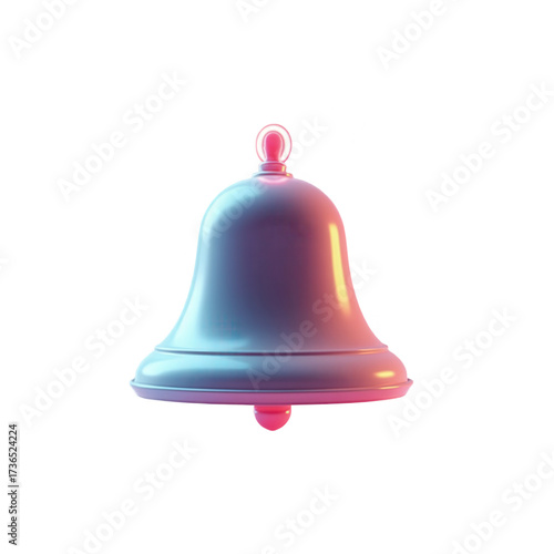 Illuminated bell features gradient hues and shiny surfaces, isolated against black background. Its design includes a hanging loop and a rounded, smooth shape, giving off a soft glow.