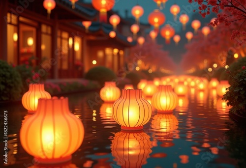 Illuminated Chinese Lanterns in a Magical Night Landscape Creating Warm Ambient Vibes