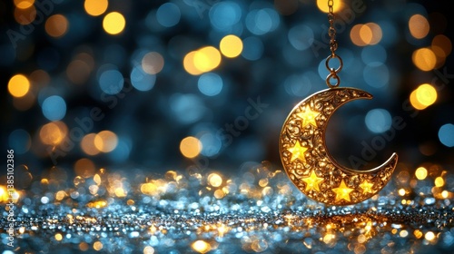 Illuminated Crescent Moon Ornament with Glittering Background