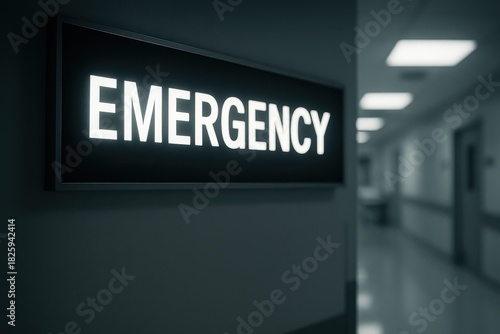 Illuminated emergency sign in hospital corridor signaling urgent medical care needs. Concept of healthcare, urgency, and crisis response in medical environments.