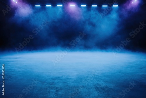 Illuminated empty space with cool stage lighting and atmospheric smoke for performance event
