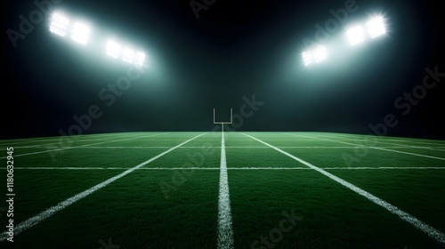 Illuminated Football Field Under Stadium Lights with Dark Background and Copy Space. Ideal for Sports, Team Events, and Marketing Concepts