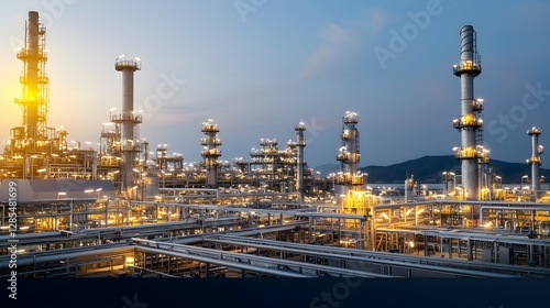 Illuminated industrial refinery with complex pipelines distillation towers and other production equipment under the dramatic night sky with glowing lights and atmospheric scenery