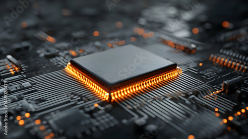Illuminated microchip displaying intricate circuits and advanced technological power in a dark ambiance